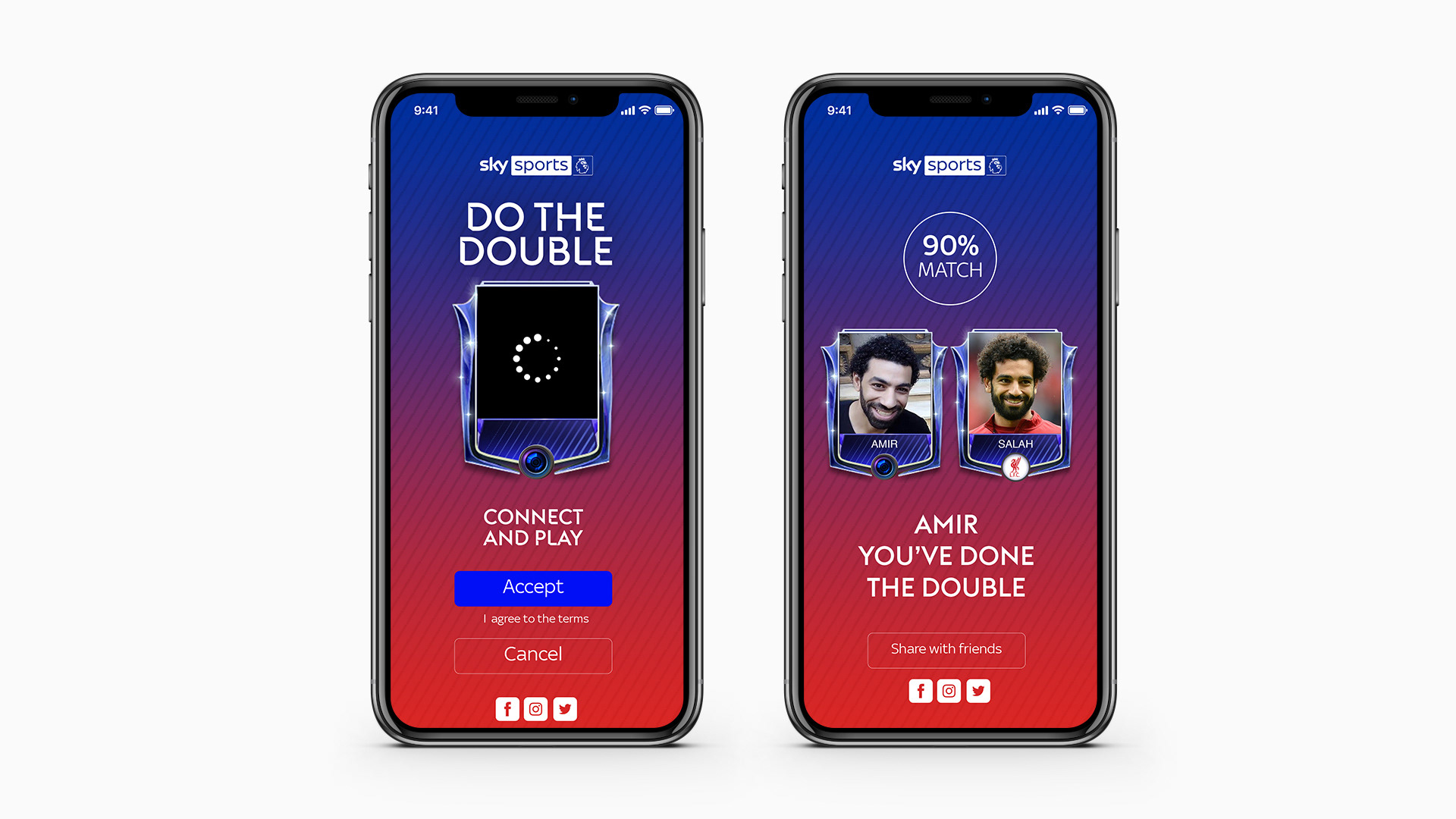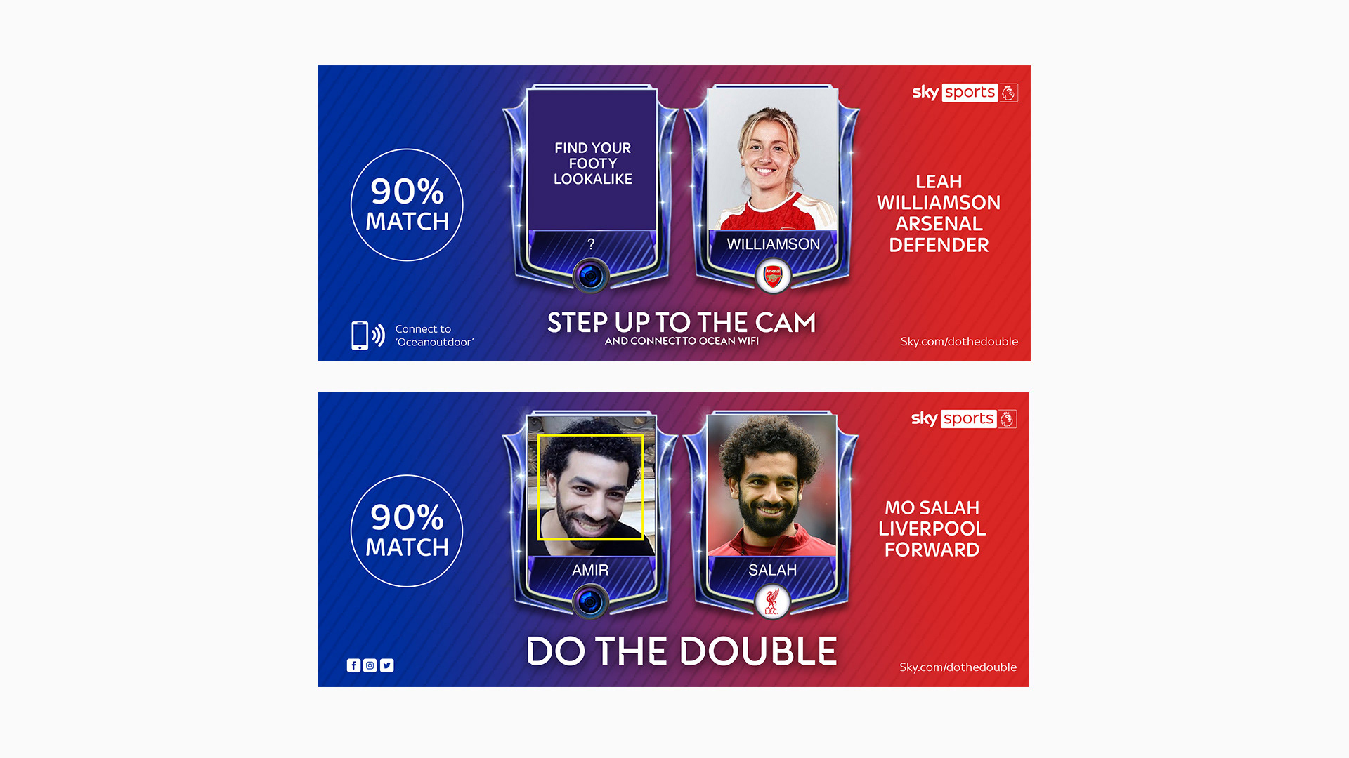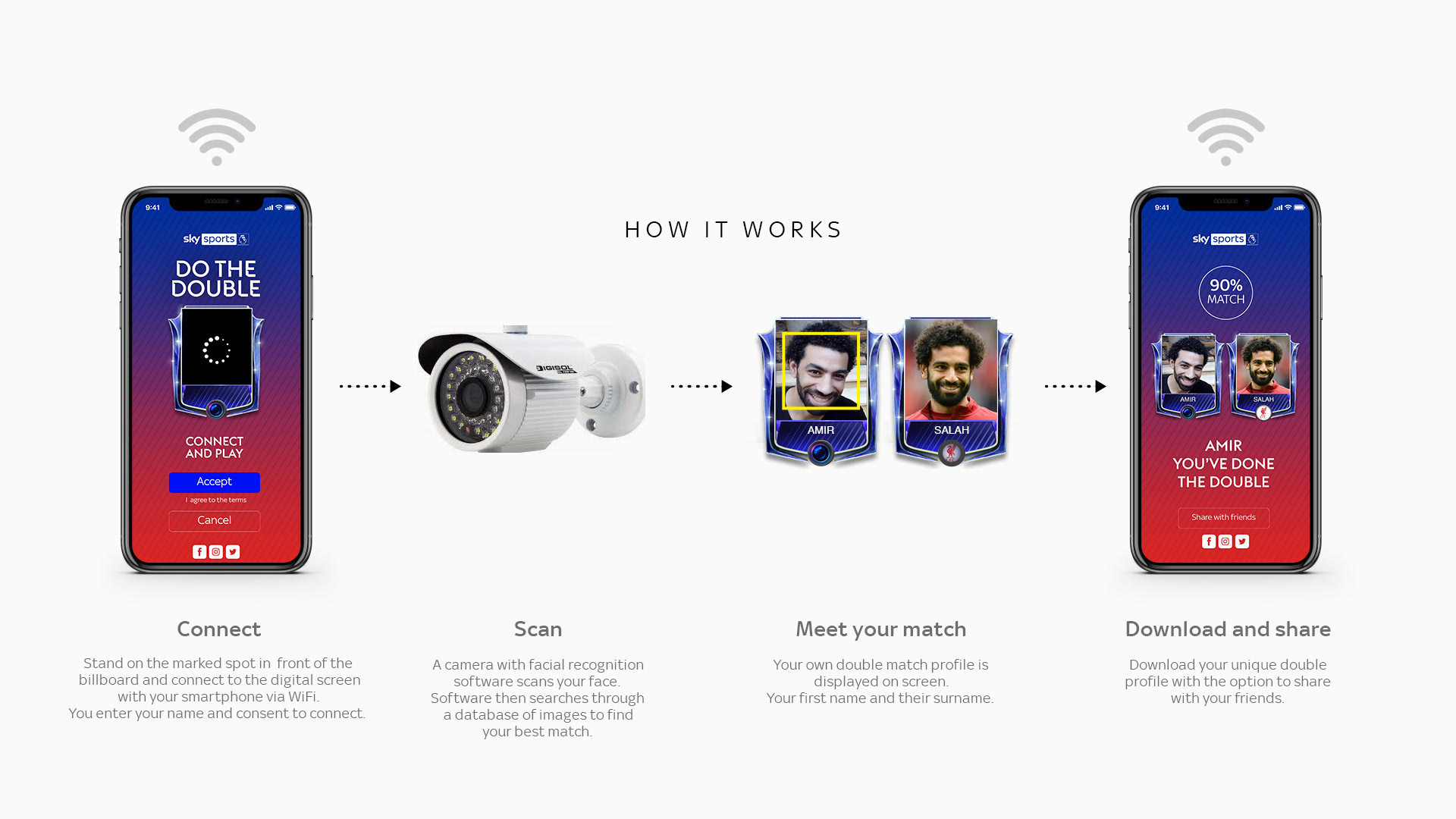 Passers-by are prompted to engage with the billboard using NFC and connecting them to an app, allowing their faces to be matched to a library of famous Premier League footballers/managers. Men's and women's faces get picked up by facial recognition software, which then finds their closest football celebrity match.